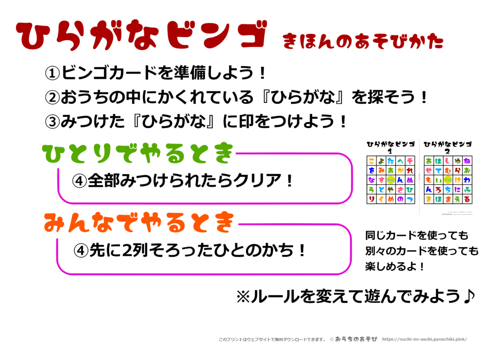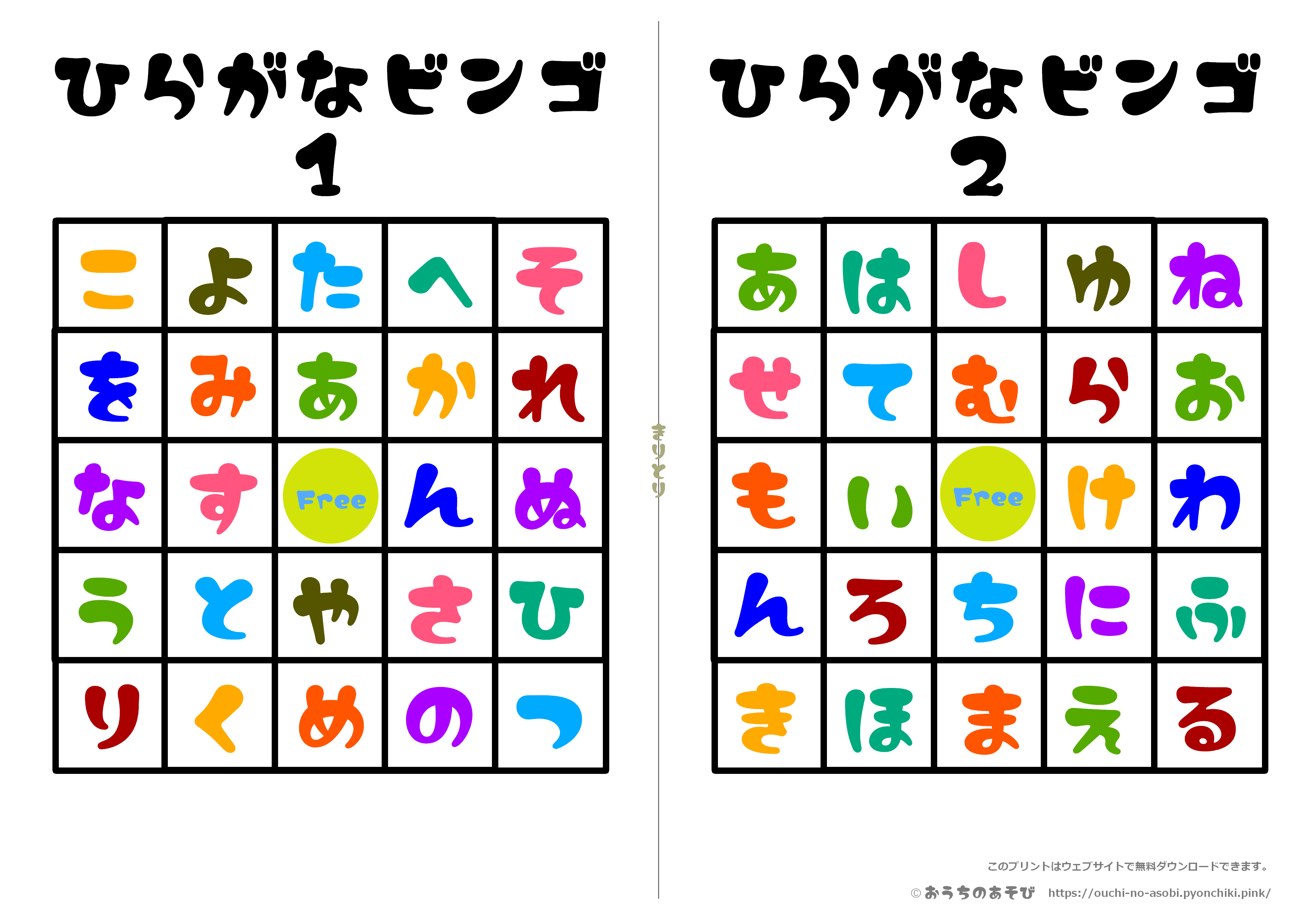 ひらがなビンゴゲーム スポンサーリンク ゲーム Twitter Facebook はてブ Pinterest コピー 2021.10.292021.08.31 おうちの中やおでかけ中に『ひらがな』をたくさん見つけちゃおう! 下のリンクからビンゴカードを印刷して遊んでね! 【ゲーム】ひらがなビンゴカード ↓遊び方はこっちのリンクから印刷してね! ひらがなビンゴ~基本のあそびかた~